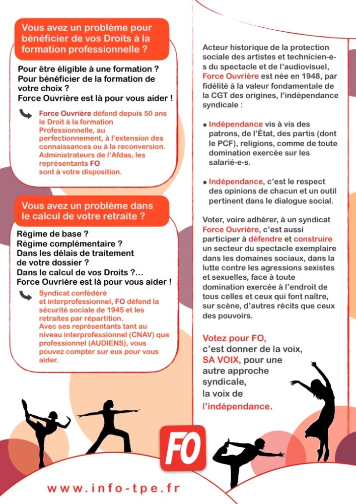 C’est pourquoi le Syndicat National Libre des Artistes FO vous invite à voter pour: