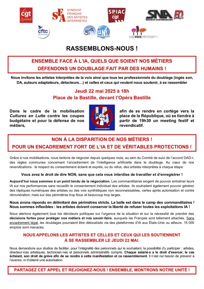 Le Syndicat français des artistes interprètes CGT, le SNAPAC-CFDT, le SNLA-FO, le SNAJ-CFTC, le SIA-Unsa et LES VOIX.FR invitent les artistes interprètes, professionnels de la voix, à se réuniren Assemblée générale